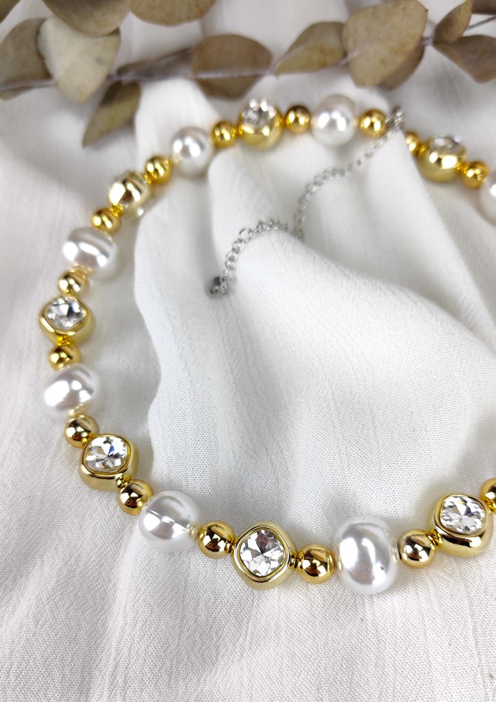 Κολιέ ατσάλι choker στρας πέρλες χρυσό