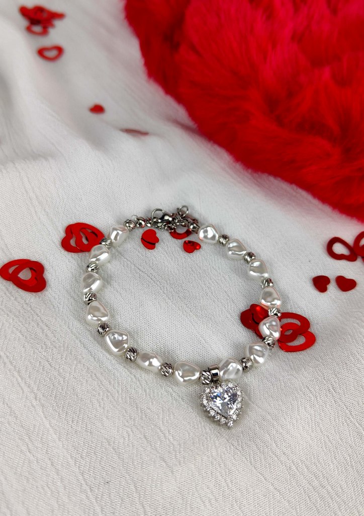 - 1 βραχιόλι με πέρλες και καρδιά με στρας από 100% ατσάλι (μήκος 18,5cm-αλυσιδάκι επέκτασης 4cm)