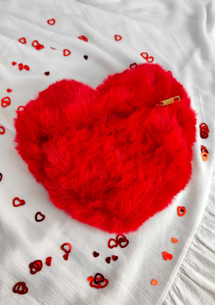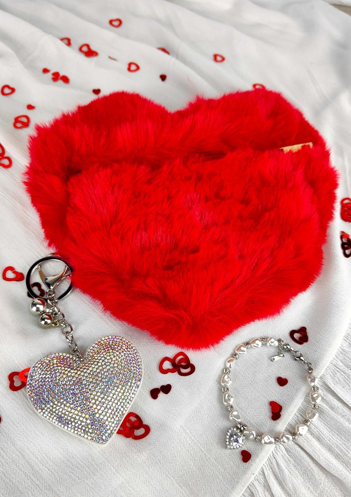 - 1 τσάντα γούνα σε κόκκινο χρώμα και σχέδιο καρδιά με χρυσή αλυσίδα ώμου, φόδρα και φερμουάρ (23 x 20cm)