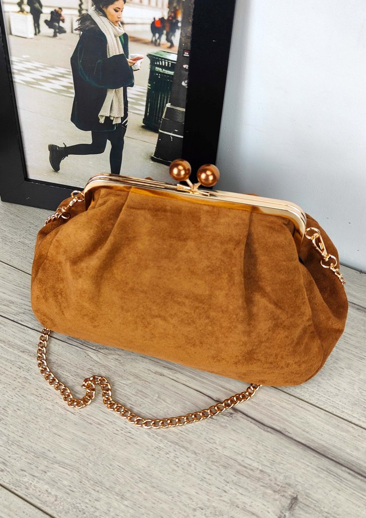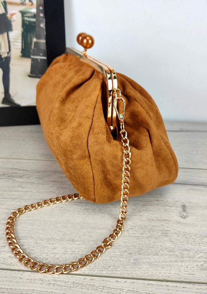 Τσάντα clutch suede αλυσίδα καμέλ