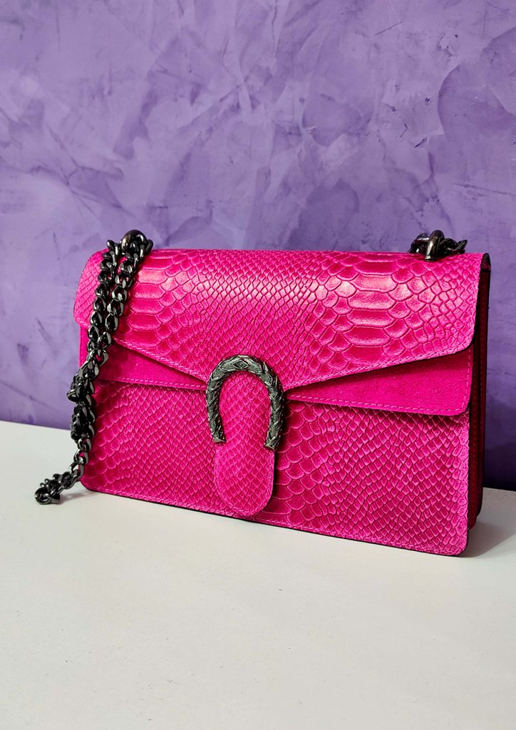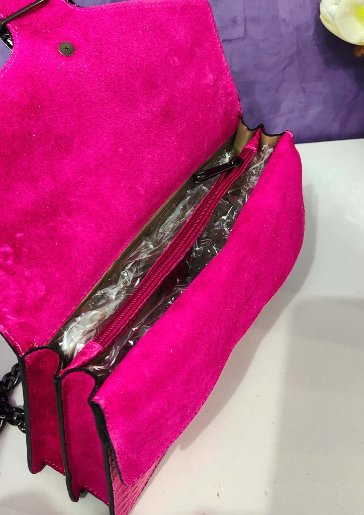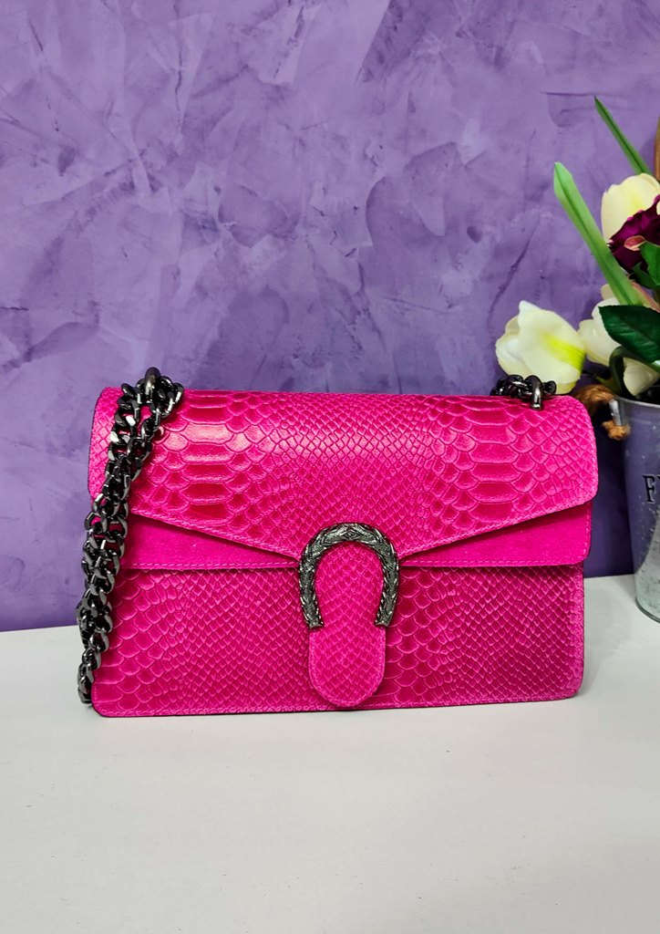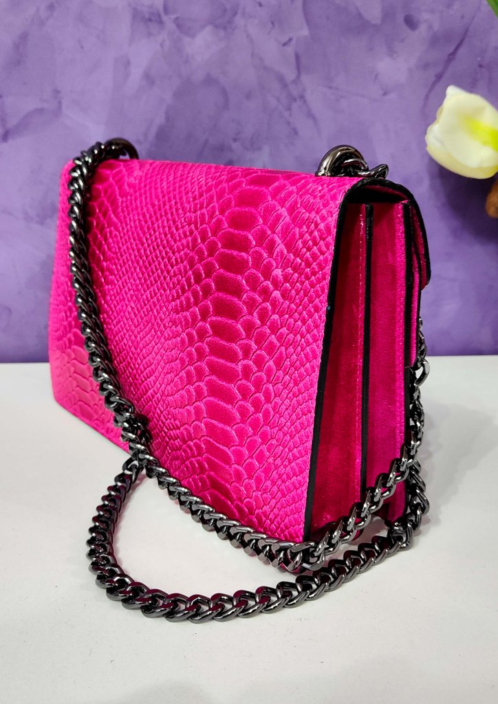 Τσάντα δερμάτινη κροκό κούμπωμα αλυσίδα φούξια