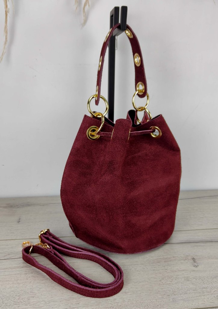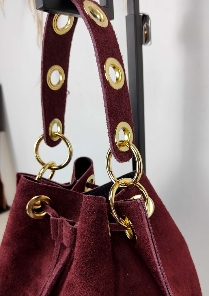 Τσάντα δερμάτινη πουγκί κρίκοι μελιτζανί