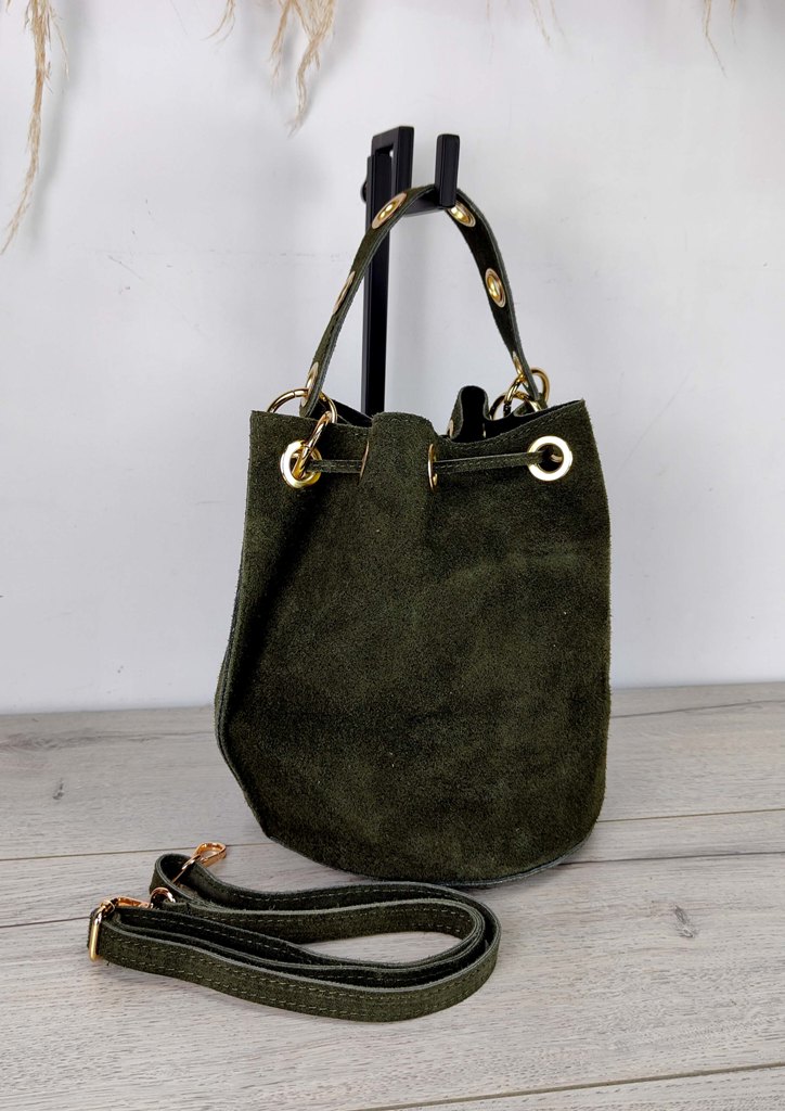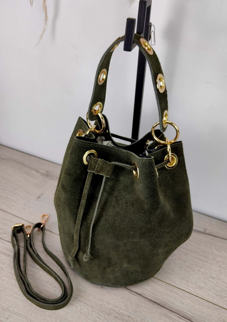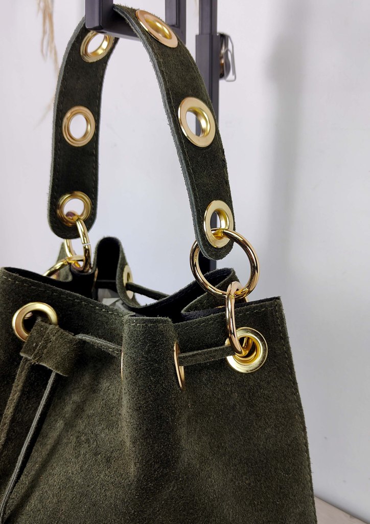 Τσάντα δερμάτινη πουγκί κρίκοι χακί