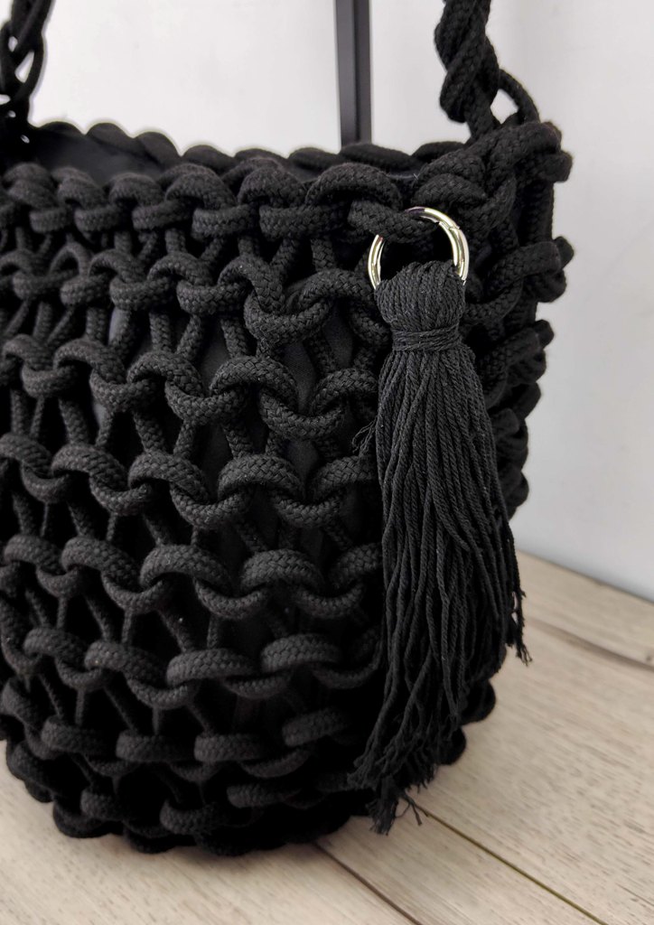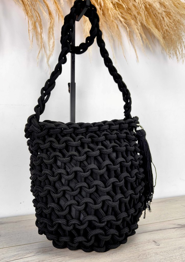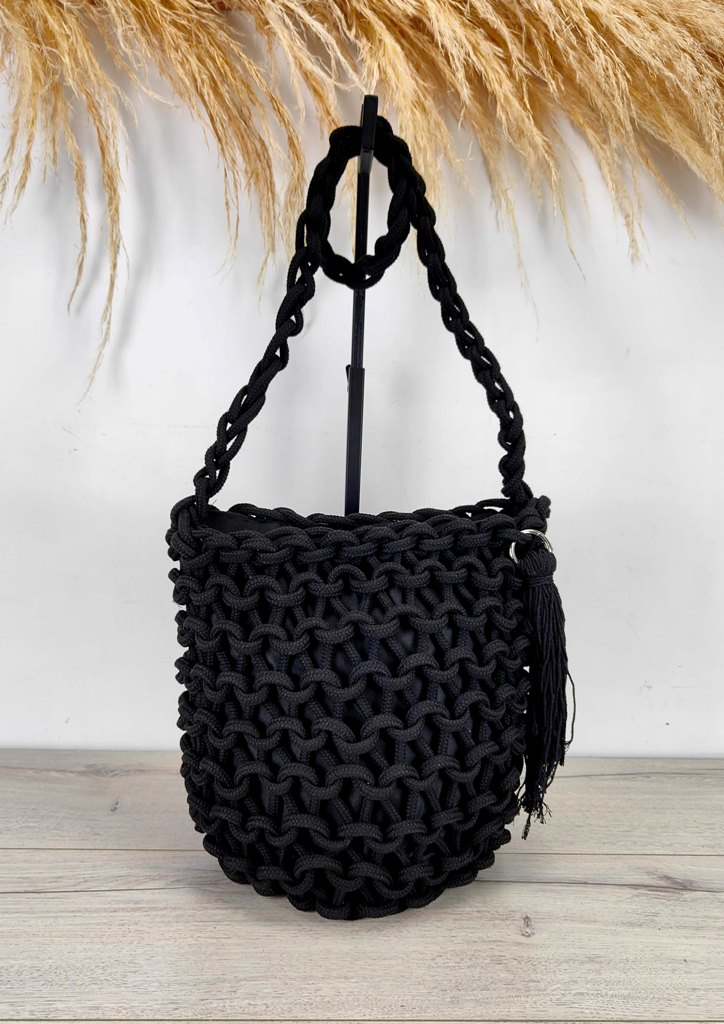 Τσάντα ώμου πλεκτή πουγκί κρόσσια μαύρο